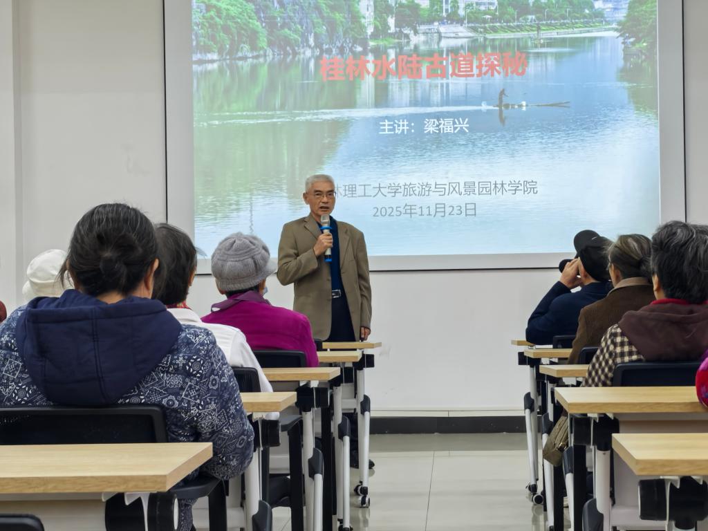 11月28日上午,两老协会特邀我校旅游与风景园林学院粱福兴教授,为老同志们带来一场题为《桂林水陆古道探秘》的精彩讲座。梁教授以其深厚的学术功底和生动的讲述,引领在场老同志穿越时空,探寻桂林水陆古道的沧桑历史与丰富内涵。