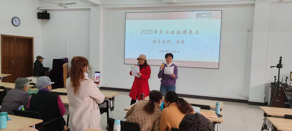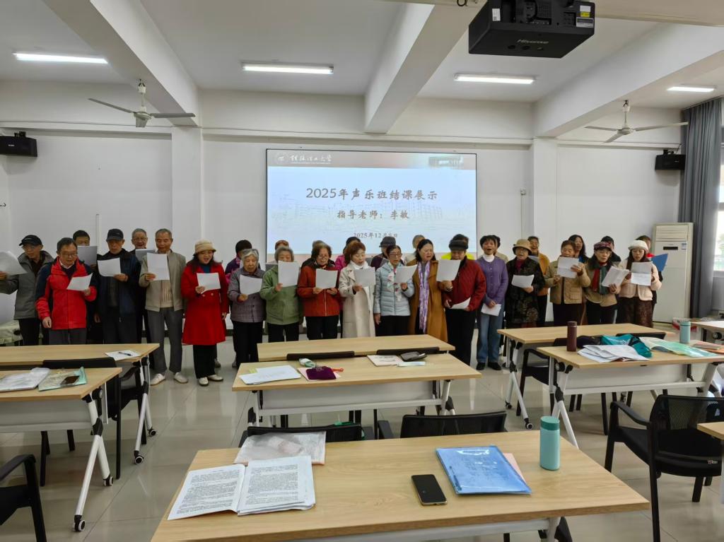 12月8日上午,老年大学2025年秋季学期声乐班在离退处212教室,以一场精彩纷呈的结课展演为本学期学习成果画上圆满句号。