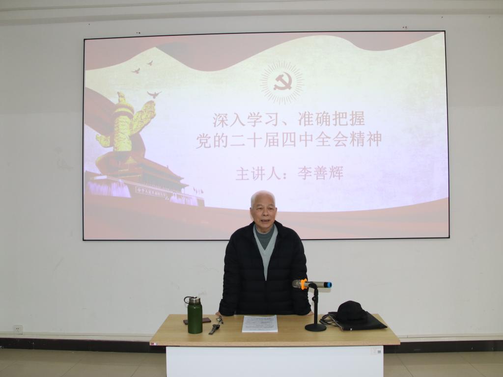 为深入学习贯彻党的二十届四中全会精神,强化离退休党员骨干思想政治建设,离退休党委举办基层党支部委员、党员骨干培训班。12月9日上午,开班第一讲由原学校党委副书记李善辉教授作题为《深入学习 准确把握党的二十届四中全会精神》的专题辅导报告。离退休党员60余人聆听了报告。报告会由离退休党委副书记张帆主持。