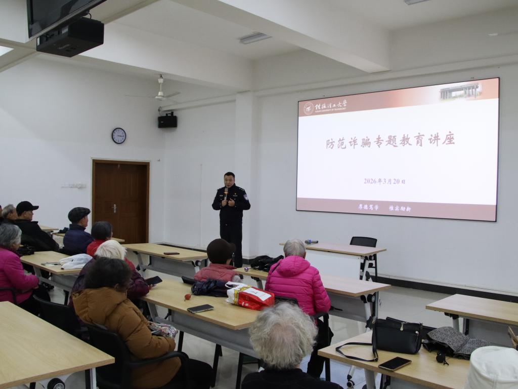 为增强我校离退休教职工防诈反诈意识,提升识诈、防诈、反诈能力,3月20日下午,离退处联合学校保卫处特邀桂林市公安局七星分局东江派出所所长蒋春晖,为我校退休教职工作防范诈骗专题教育讲座。
