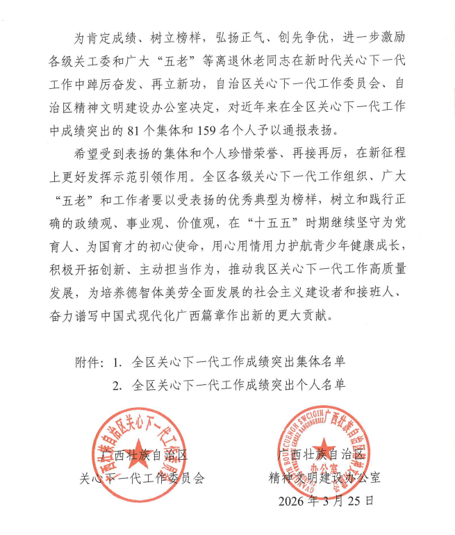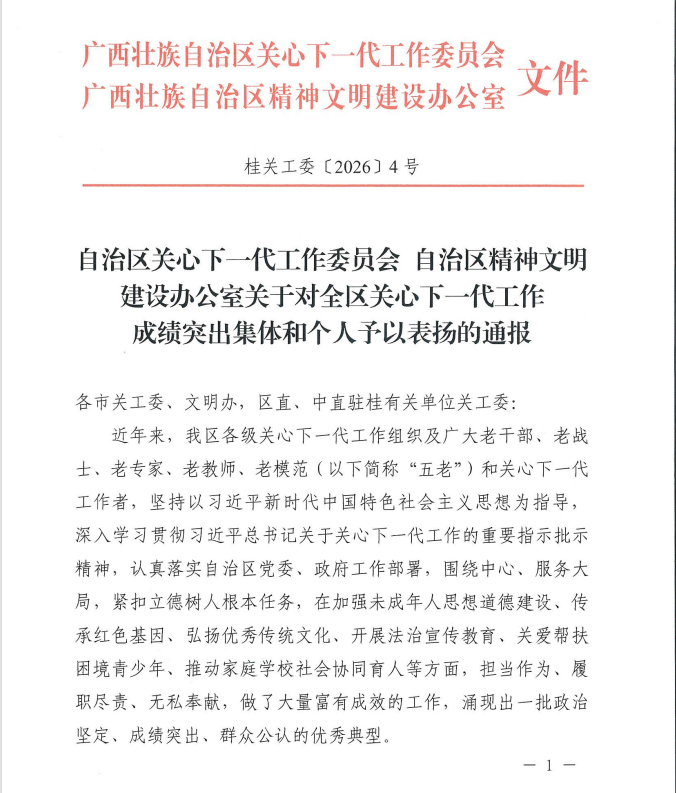 近日,广西壮族自治区关心下一代工作委员会、自治区精神文明建设委员会办公室联合发布表彰决定,我校凭借关心下一代工作的扎实举措、显著成效与突出贡献,荣获“全区关心下一代工作成绩突出集体”荣誉称号。这一殊荣,是对我校长期深耕青少年教育事业、践行立德树人根本任务的高度认可与有力激励。