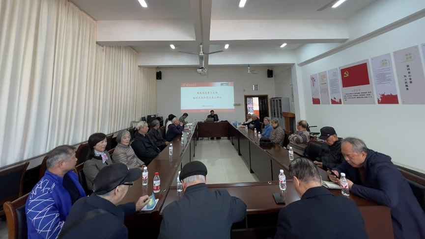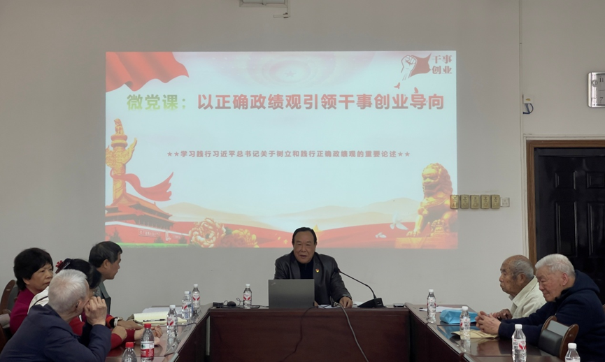 首先支部书记郎耀秀以《以正确政绩观引领干事创业导向》为题,为全体党员讲授了专题党课。党课结合离退休党员的实际,从“政绩观与人民观、历史观、发展观、事业观的内在逻辑”“为党分忧、为国尽责、为民奉献的实践要求”以及“创造经得起实践、人民、历史检验的实绩”三个维度展开。会议强调,虽然老同志们离开了工作岗位,但仍要坚守“离岗不离党、退休不褪色”的政治本色,在家庭教育、社区建设、关心下一代等方面发挥余热,将正确政绩观落实到发挥党员先锋模范作用的具体行动中。